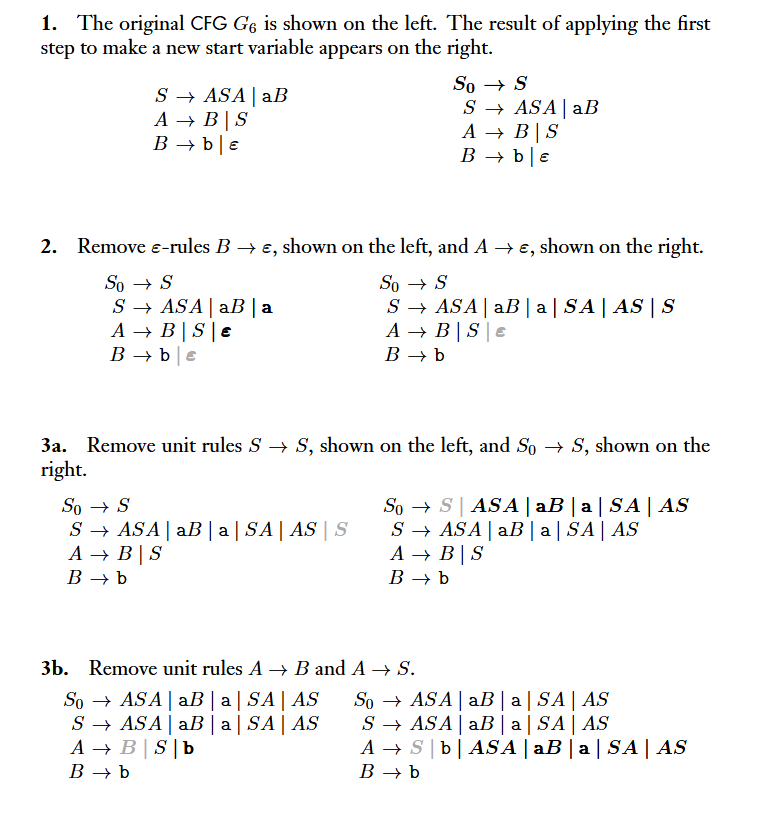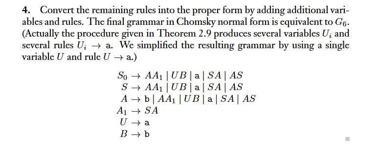 DefinitionA context-free grammar is in Chomsky normal form if every rule is of the form , where is any terminal and , , and are any variables except that and may not be the start variable. In addition we permit the rule , where is the start variable.