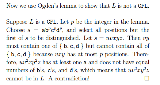If is a context-free language, then there is a number p where, if is any string in of length at least , in which we select any or more positions to be distinguished, then may be divided into five pieces, satisfying the conditions:
