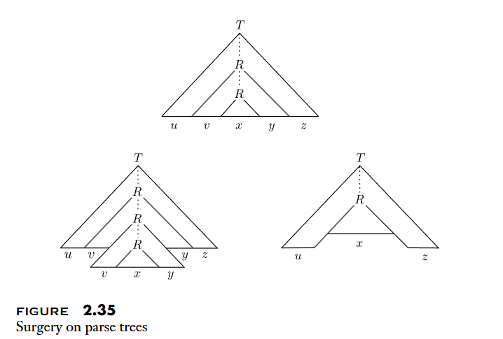Pumping Lemma for RL的證明方式,透過鴿籠原理,當parse tree的樹高足夠時 (> variables 總數),必定存在variable R在一條路徑中經過兩次以上,因此可以對其產生出的string進行Pumping而仍然屬於CFL