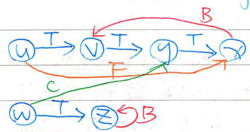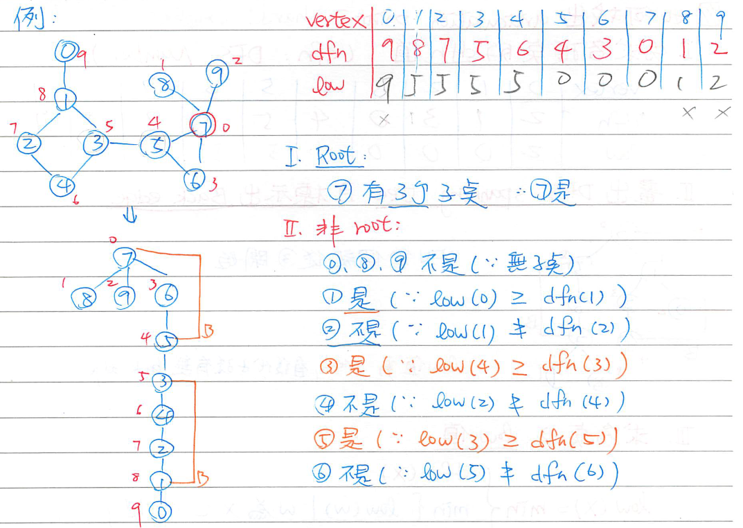 - low(x)=min(dfn(x),{dfn(y) ∣ y 為 x 的後代 (含 x) 中最多經過一條 Back edge 所到之點})