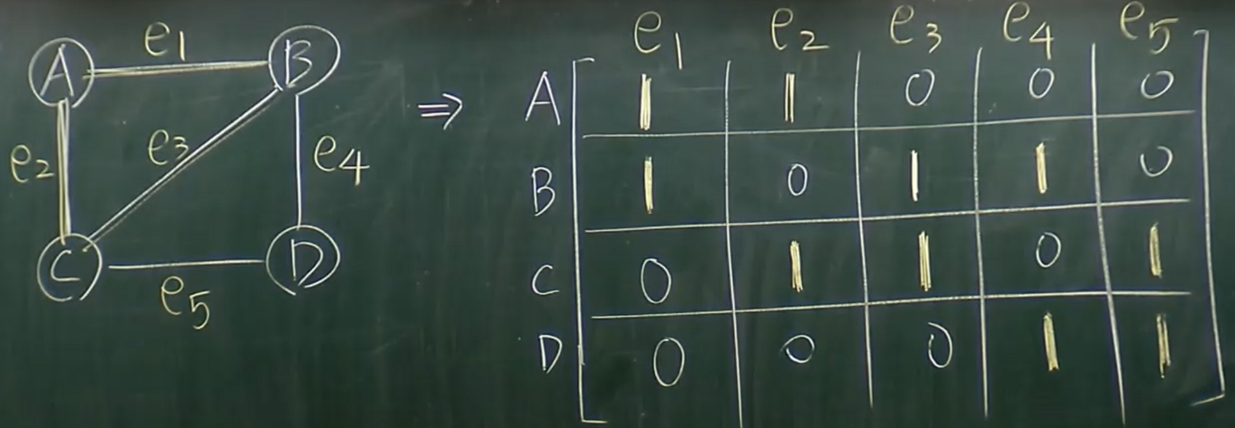 - 令 G=<V,E>, ∣V∣=n,則準備一個 matrix A:n∗n,其中 A[i,j]=