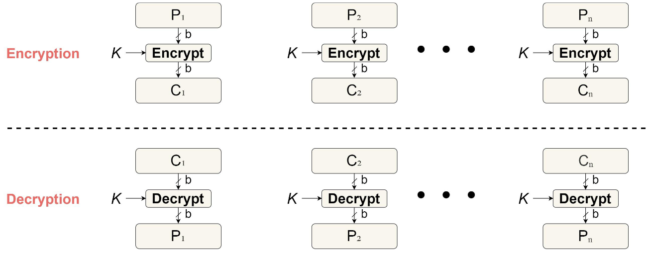 • 將固定大小的明文區塊 (plaintext blocks) 轉為相同大小的密文區塊 (ciphertext blocks)