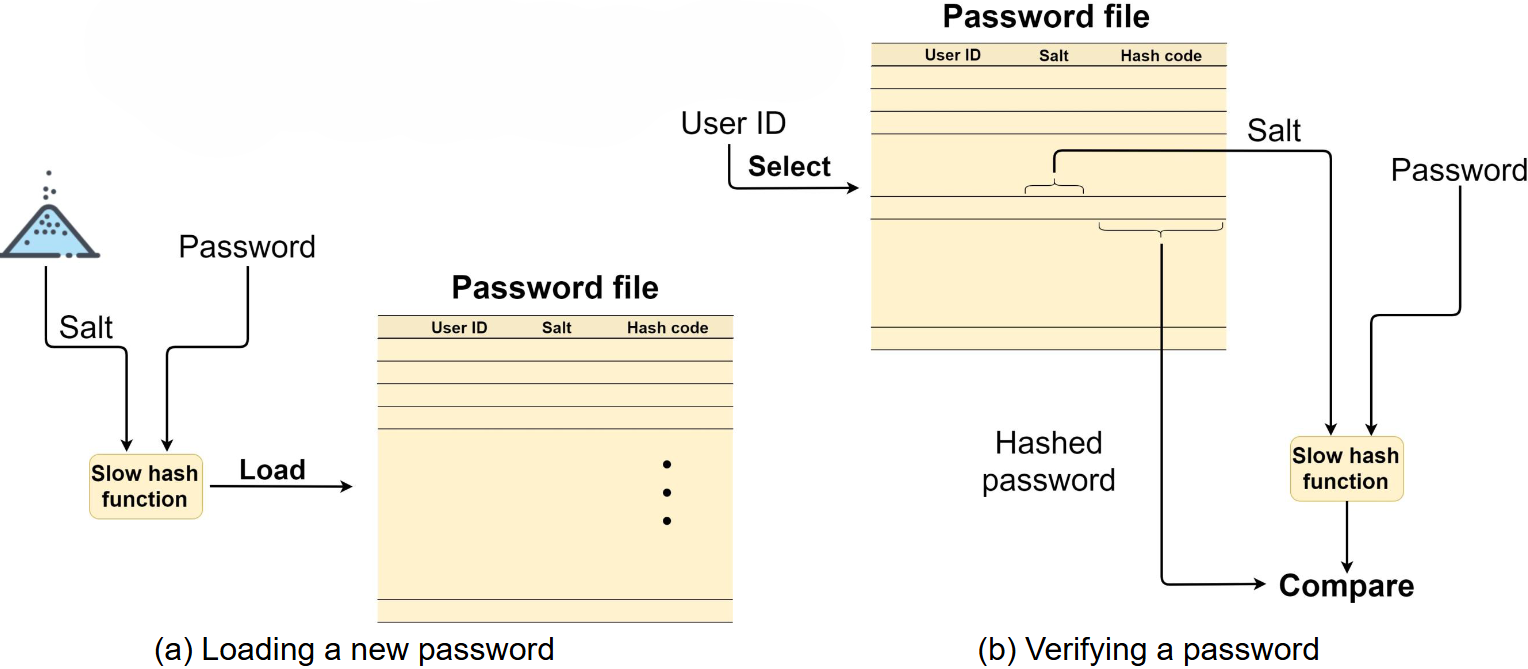 • Rainbow table attacks: Pre-compute tables of hash values for all salts